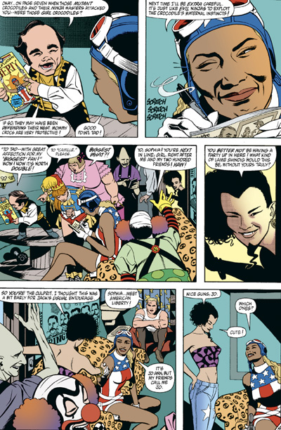 Libertad Americana es retratada como un personaje corporativo, con todo lo que ello conlleva. No solo tiene muchísimo dinero y fama, sino que también tiene que tratar con algún que otro indeseable por conveniencia, lo cual me hace recordar a los superhéroes a partir de finales de los 80 y los 90, logrando así un contraste notable con la Polilla que mayormente recuerda un héroe de décadas anteriores.