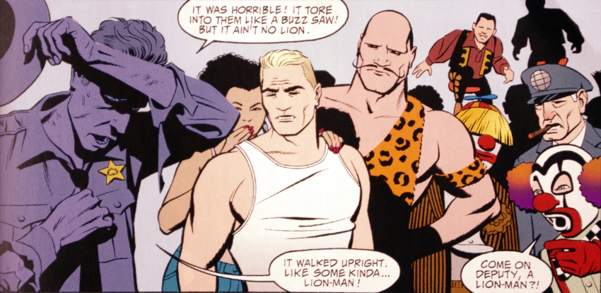 Ese dinero va a parar al hogar de nuestro héroe, cuya identidad real es Jack Mahoney, un acróbata de circo, que convive con los típicos fenómenos de feria a los cuales iremos conociendo poco a poco (y que, en mi opinión, muestran el saber hacer del guionista, pues lo poco que aparecen dejan cierta huella). Ahí conoceremos al jefe del circo Víctor (que en cierto modo parece una figura paterna para todos), a Sophia, una atractiva mujer barbuda (que parece ser el interés romántico de Jack o, al menos, una persona muy cercana que no duda en decirle las cosas claras a nuestro héroe), al forzudo Melvin (con el cual Jack tiene cierta rivalidad en el campo físico), los payasos Cosmo y Emit (que disfrutan fastidiando a Jack) o Tad (el hermano de Jack, que sufre de enanismo y al parecer tampoco está totalmente desarrollado en cuanto a madurez mental). Este último es clave para Jack, pues nacieron siendo siameses, y al parecer, todo lo bueno quedó en Jack, dejando a Tad con lo mínimo, lo cual hace que nuestro protagonista sienta culpa y sobreproteja a su hermano, además de costearle todos los tratamientos.